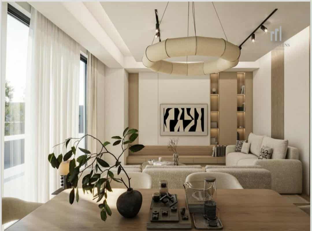 Διαθέτει δύο υπνοδωμάτια, εκ των οποίων το ένα είναι master με ιδιωτικό μπάνιο (en suite), καθώς και ένα επιπλέον μπάνιο. Το σαλόνι, η τραπεζαρία και η κουζίνα είναι ενιαίας διαρρύθμισης, δημιουργώντας έναν φωτεινό και άνετο χώρο καθημερινής διαβίωσης.