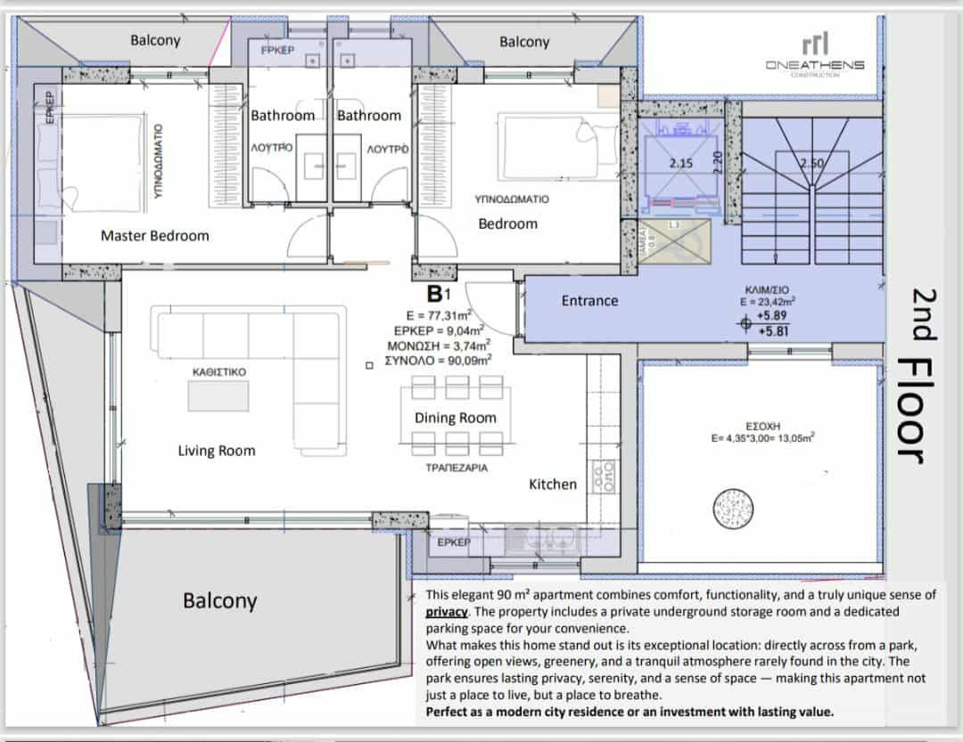 Ένα κομψό διαμέρισμα 90 τ.μ. στον δεύτερο όροφο, που συνδυάζει άνεση, λειτουργικότητα και μια πραγματικά μοναδική αίσθηση ιδιωτικότητας. Συνοδεύεται από αποθήκη και θέση στάθμευσης στο υπόγειο.