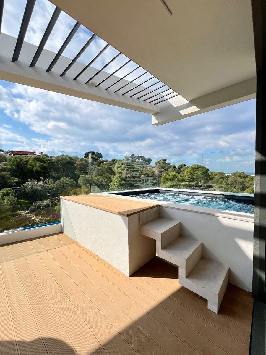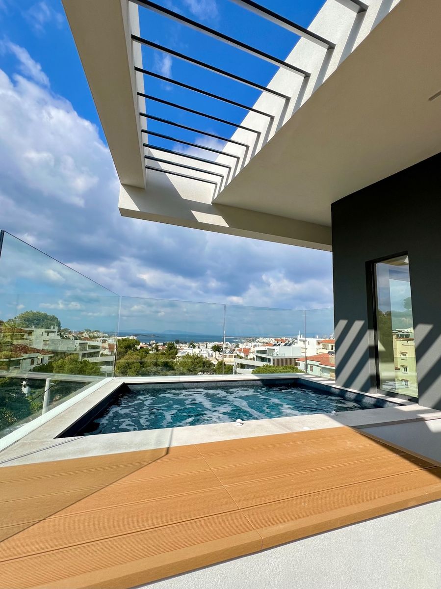 • Μεγάλο μπαλκόνι με απρόσκοπτη θέα θάλασσας και jacuzzi, προσφέροντας μοναδικές στιγμές απόλυτης ευεξίας.