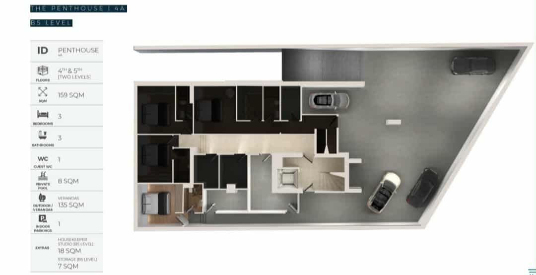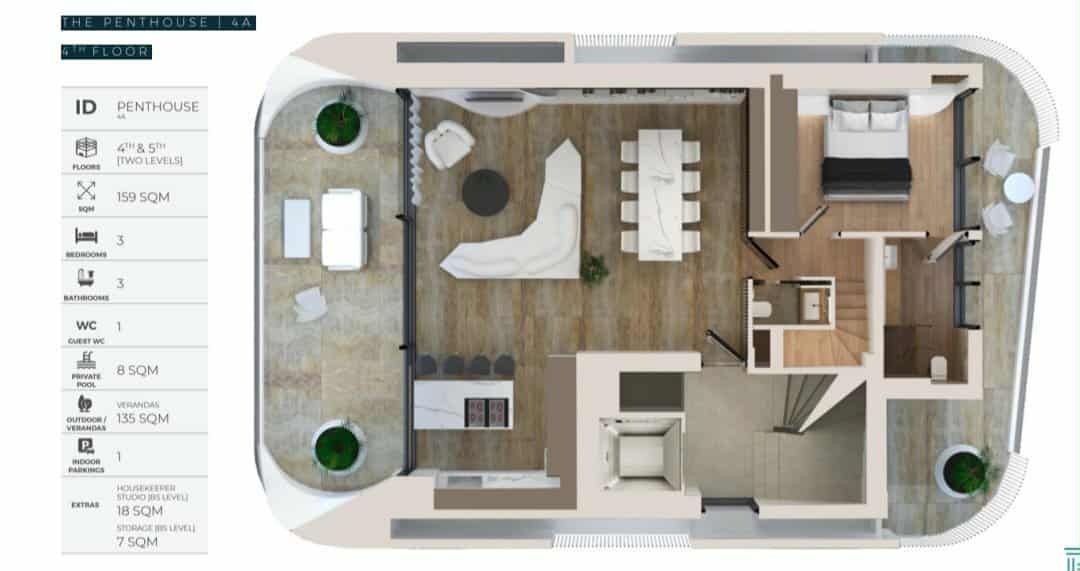Μοναδικό δίπεδο ρετιρέ (4ος & 5ος όροφος) συνολικής εσωτερικής επιφάνειας 141 τ.μ., με φωτεινούς, άνετους και ευρύχωρους χώρους καθιστικού. Το διαμέρισμα διαθέτει 3 master υπνοδωμάτια, 1 WC και εντυπωσιακές βεράντες 13 τ.μ., καθώς και ιδιωτική πισίνα, προσφέροντας ιδανικό περιβάλλον για πολυτελή διαβίωση.