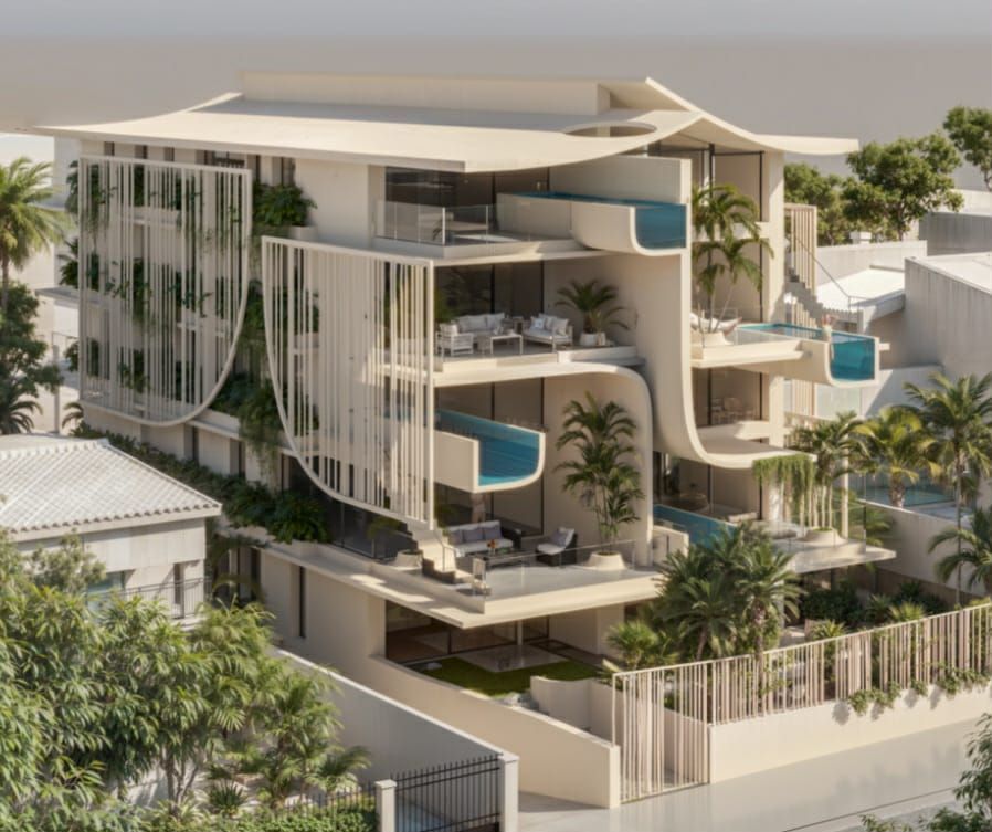 Ο αρχιτεκτονικός σχεδιασμός του κτιρίου συνδυάζει οργανικές καμπύλες με καθαρές, μοντέρνες γραμμές, δημιουργώντας μια εντυπωσιακή και κομψή όψη. Η αρμονική ροή των επιπέδων, σε συνδυασμό με την πλούσια φύτευση και τις ιδιωτικές πισίνες, ενισχύει την πολυτελή αίσθηση του ακινήτου.
