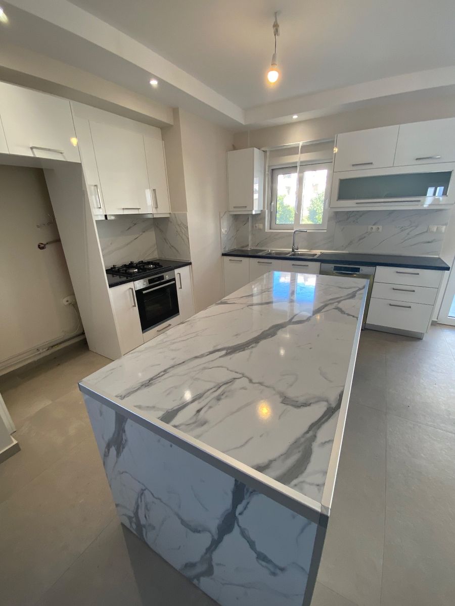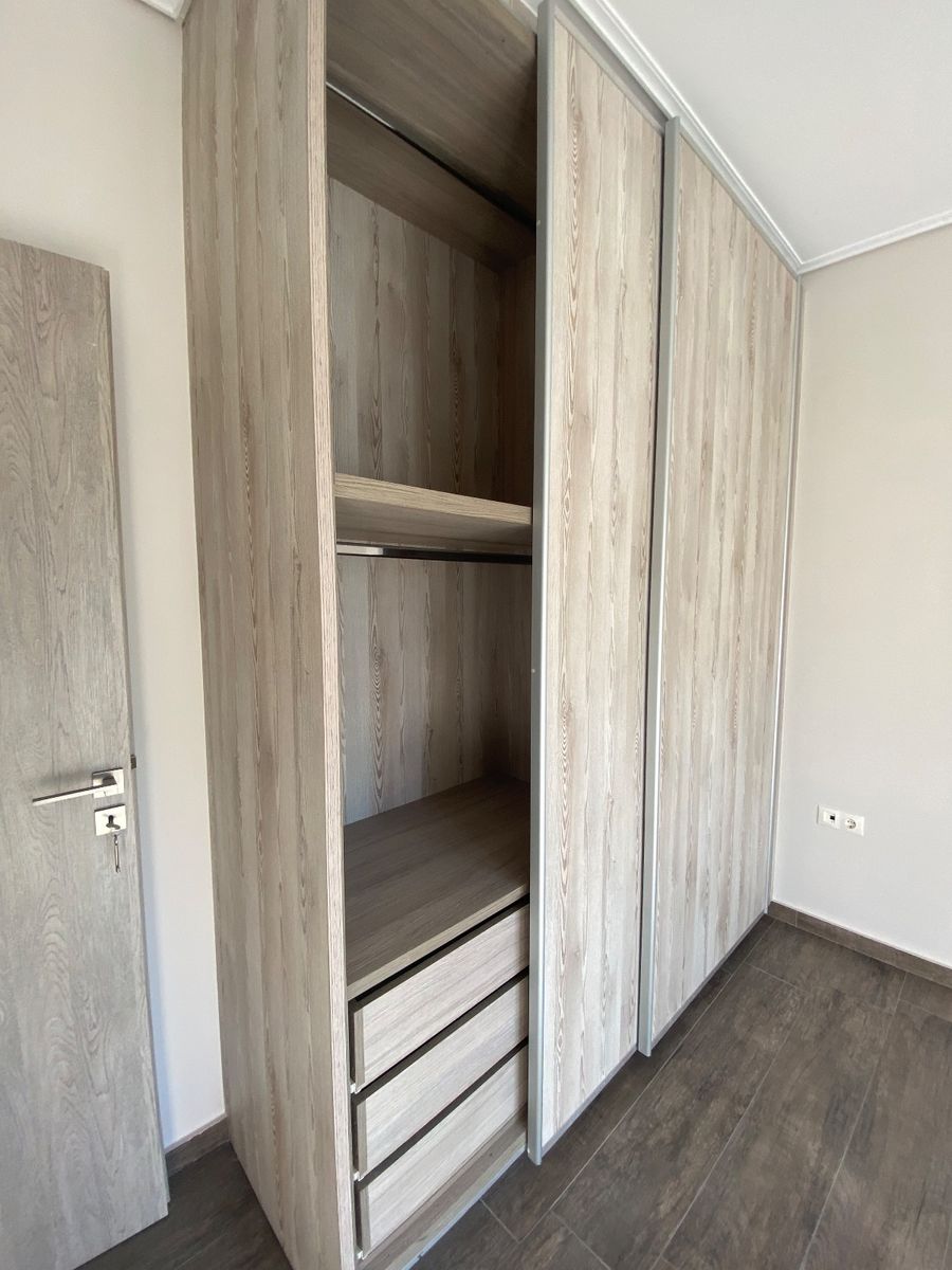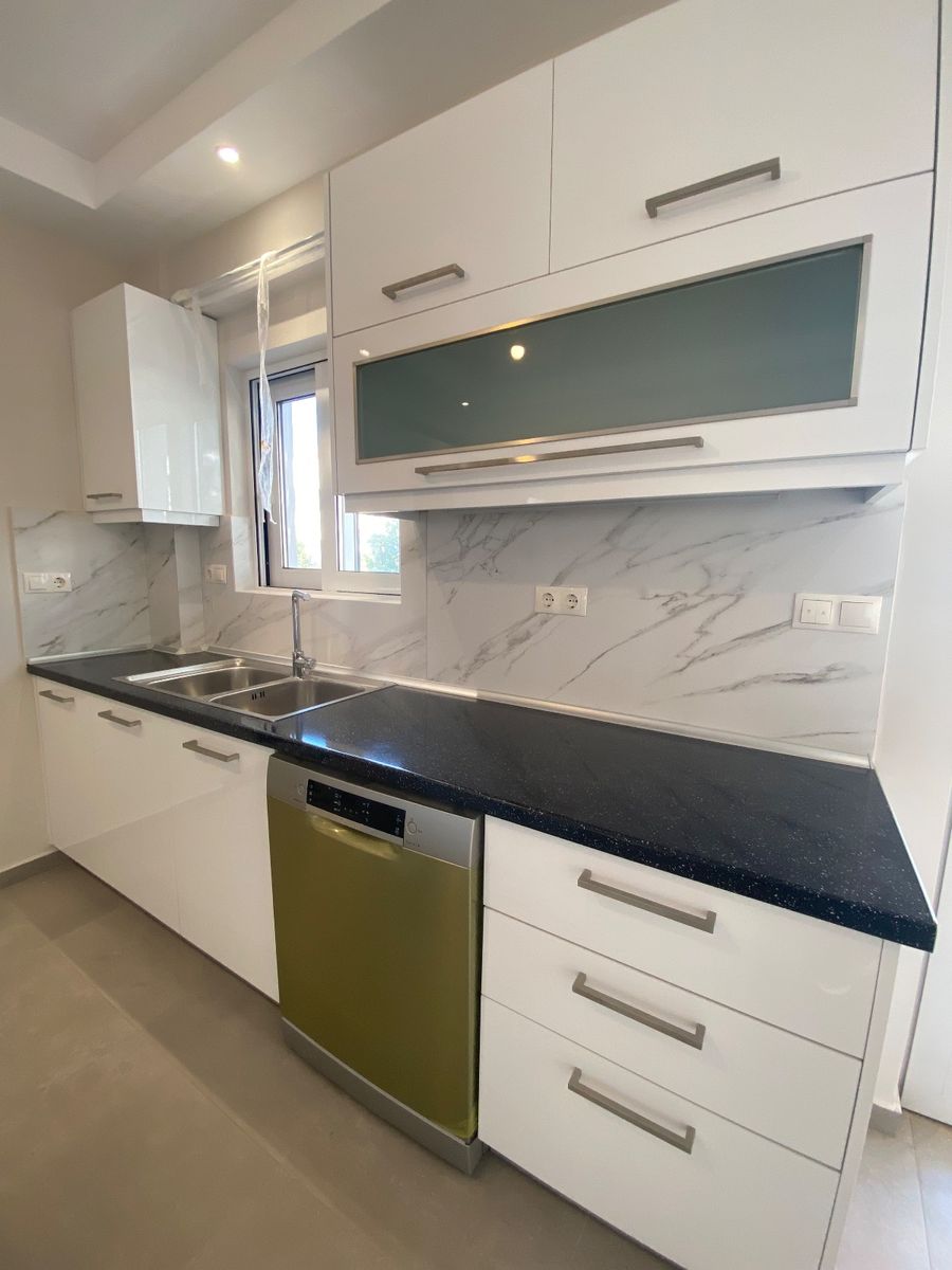 Το διαμέρισμα διαθέτει φωτεινή ενιαία διαρρύθμιση που συνδυάζει καθιστικό, τραπεζαρία και κουζίνα, δημιουργώντας έναν φιλόξενο και πρακτικό χώρο διαβίωσης. Η σύγχρονη κουζίνα είναι πλήρως εξοπλισμένη με εντοιχισμένες ηλεκτρικές συσκευές, με εξαίρεση το πλυντήριο ρούχων και τον φούρνο μικροκυμάτων.