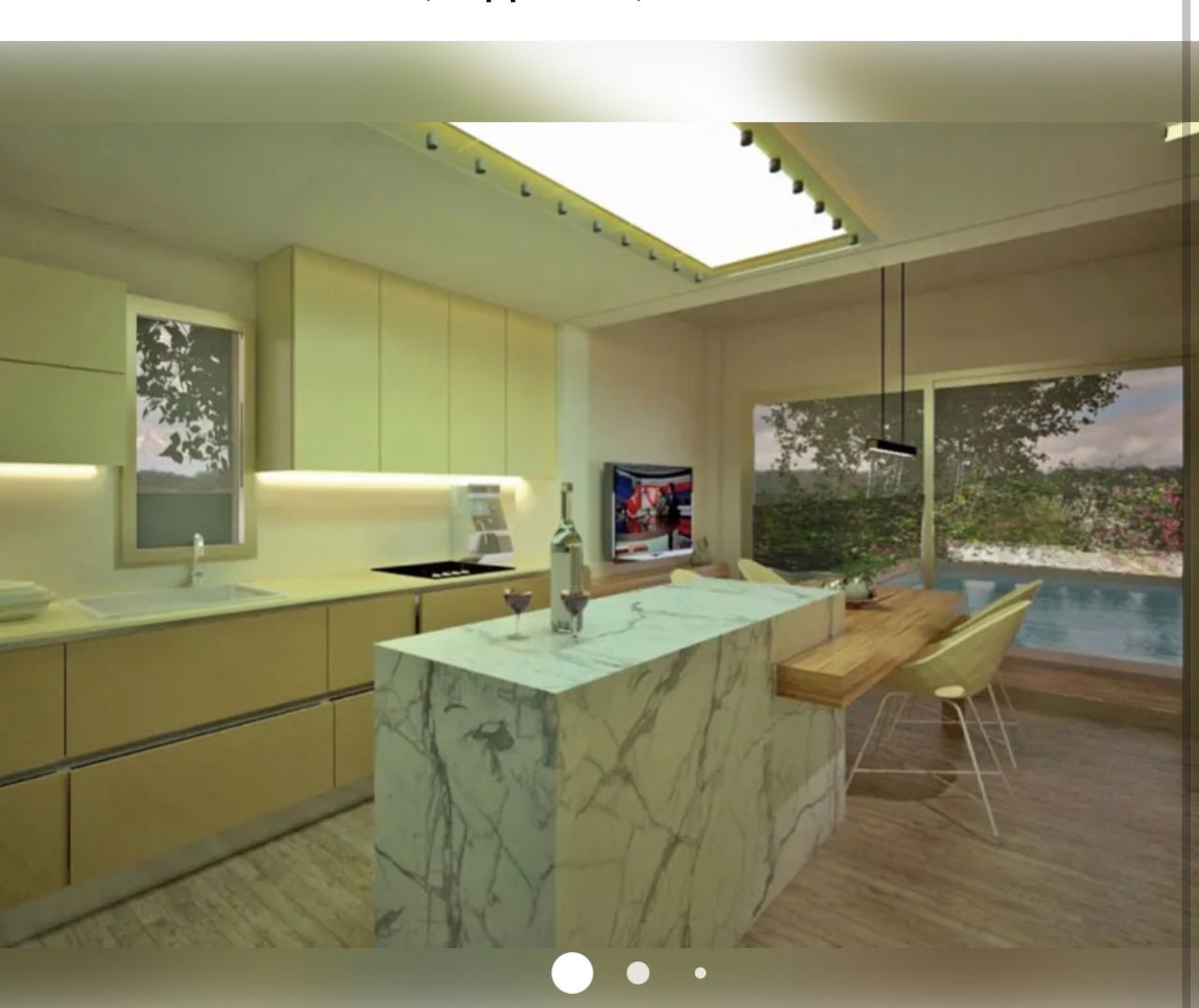 Ενιαίος, φωτεινός χώρος καθιστικού, τραπεζαρίας και σύγχρονης κουζίνας, με άμεση πρόσβαση στον κήπο και την πισίνα — ιδανικός για στιγμές χαλάρωσης και φιλοξενίας.