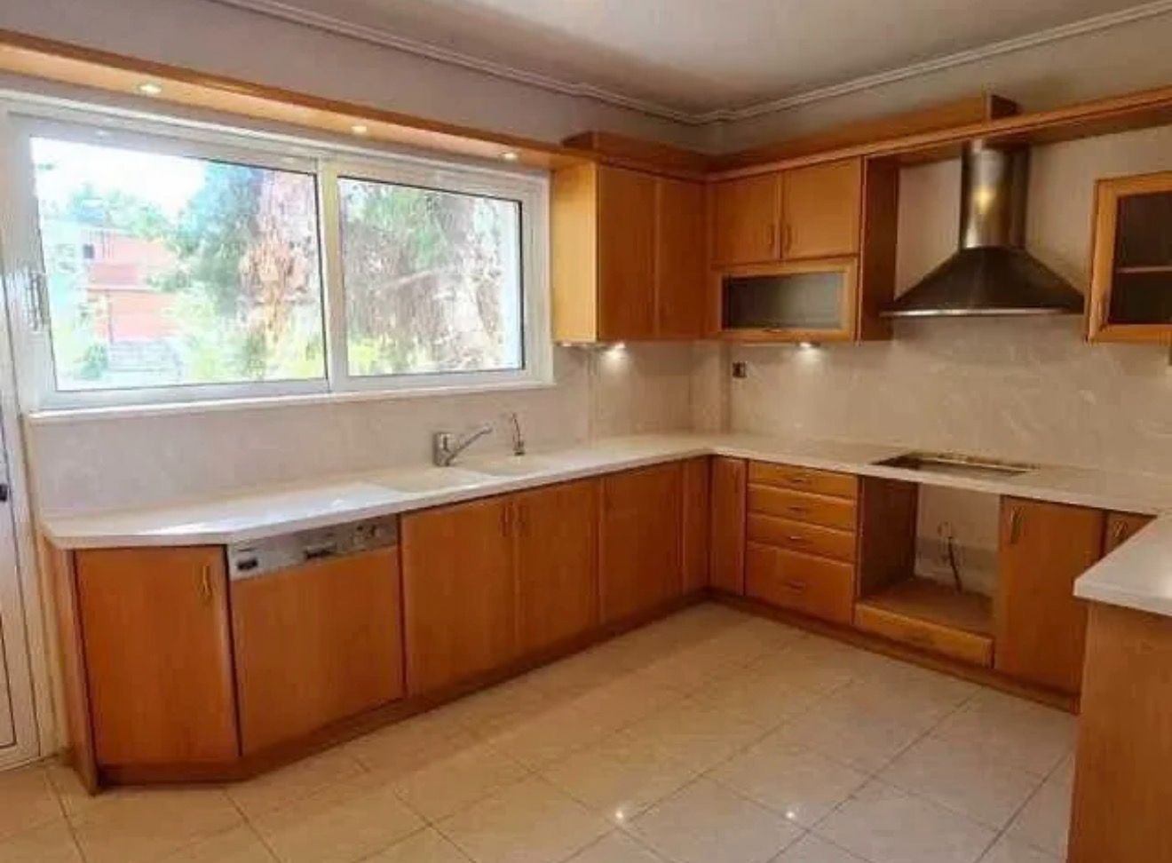 Ευρύχωρο σαλόνι με τζάκι και μεγάλα ανοίγματα προς τον κήπο, ξεχωριστή κουζίνα, WC επισκεπτών.