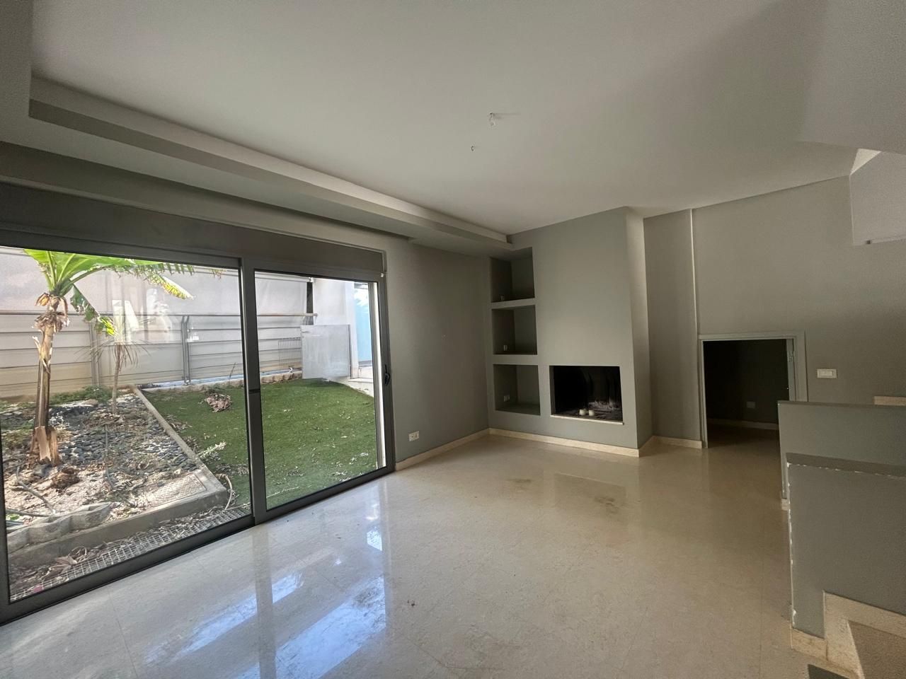 Φωτεινό σαλόνι με τζάκι και άμεση πρόσβαση στον εξωτερικό χώρο