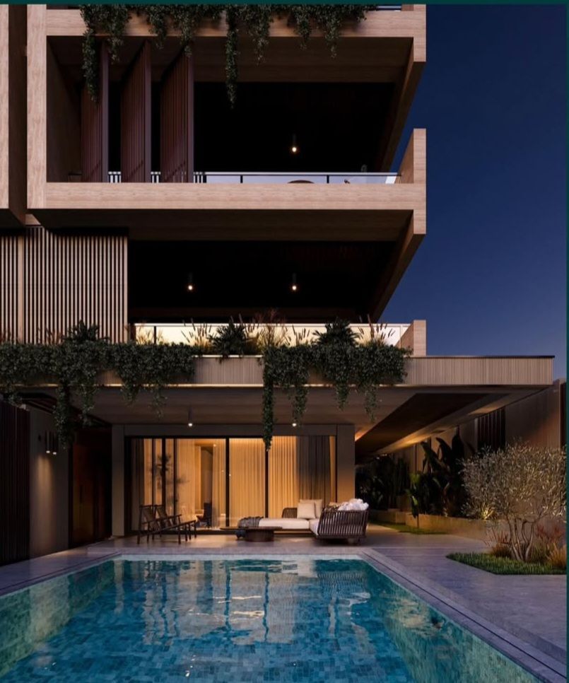 Το ισόγειο επίπεδο ανοίγει σε ιδιωτικό κήπο 340 τ.μ., όπου βρίσκεται ιδιωτική πισίνα 21 τ.μ., δημιουργώντας έναν ιδανικό χώρο χαλάρωσης και φιλοξενίας. Η κατοικία διαθέτει συνολικά 3 ευρύχωρα υπνοδωμάτια και 3 σύγχρονα μπάνια, σχεδιασμένα με έμφαση στη λειτουργικότητα και την αισθητική.
