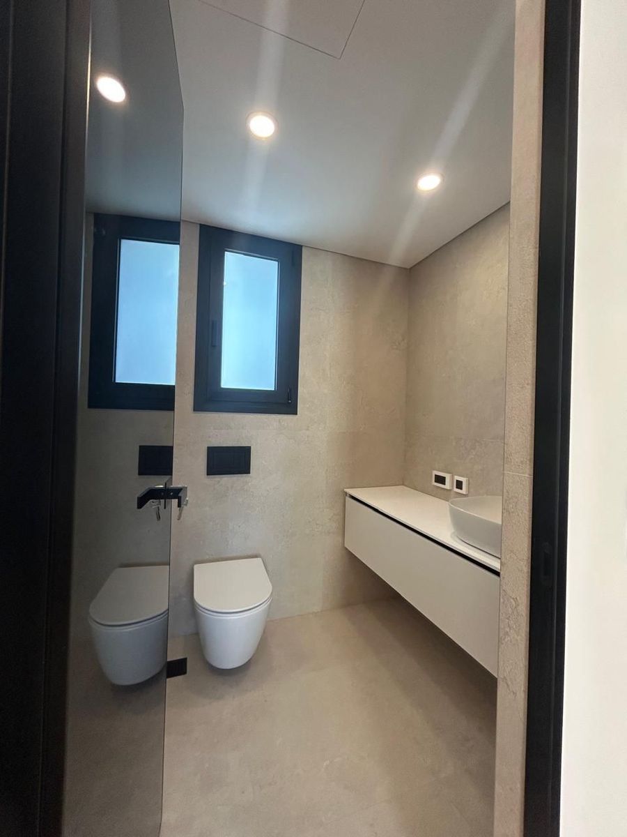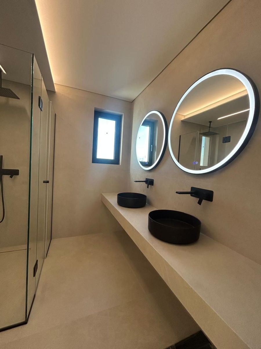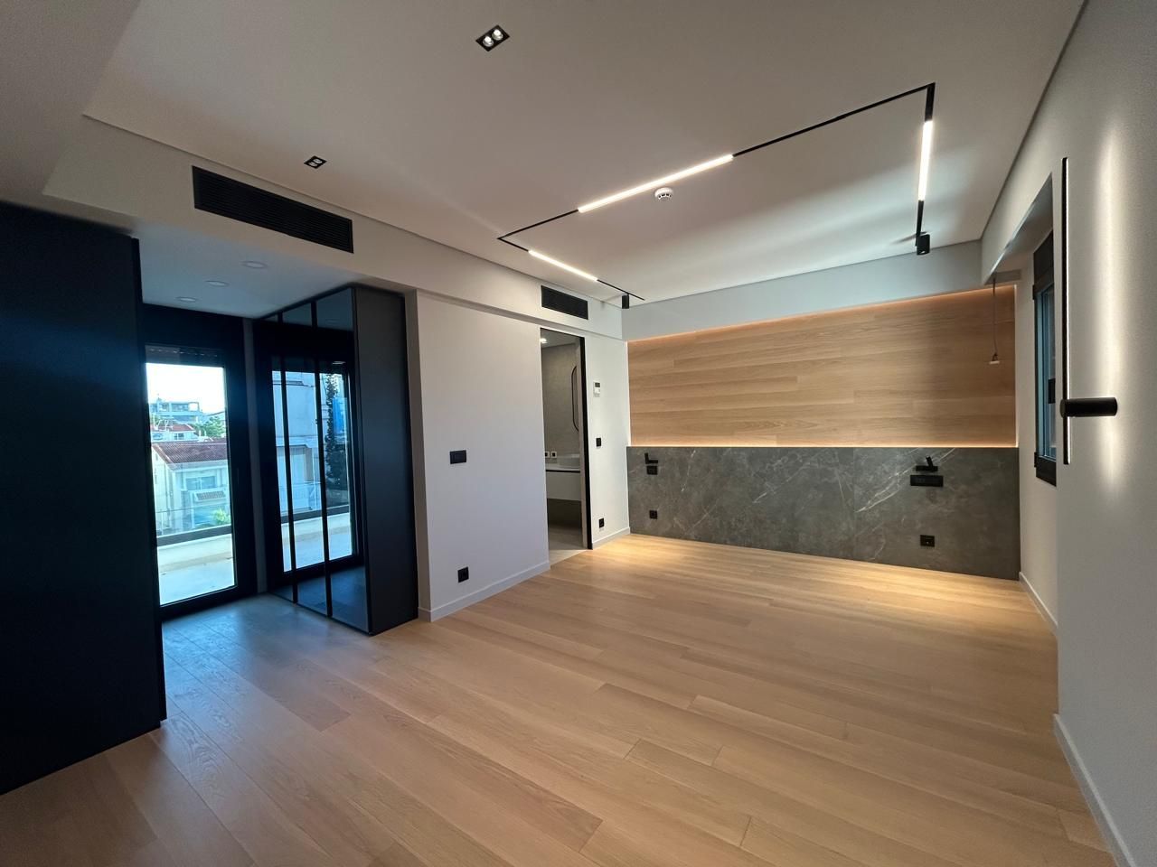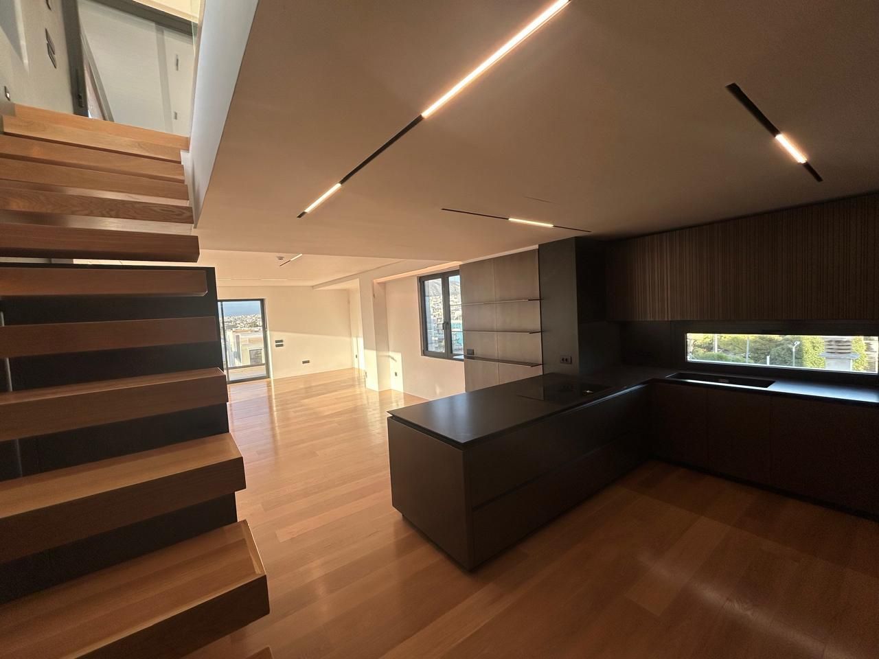 Τα δύο επίπεδα συνδέονται με εντυπωσιακή εσωτερική σκάλα minimal σχεδιασμού, ενισχύοντας τη σύγχρονη ταυτότητα της κατοικίας.