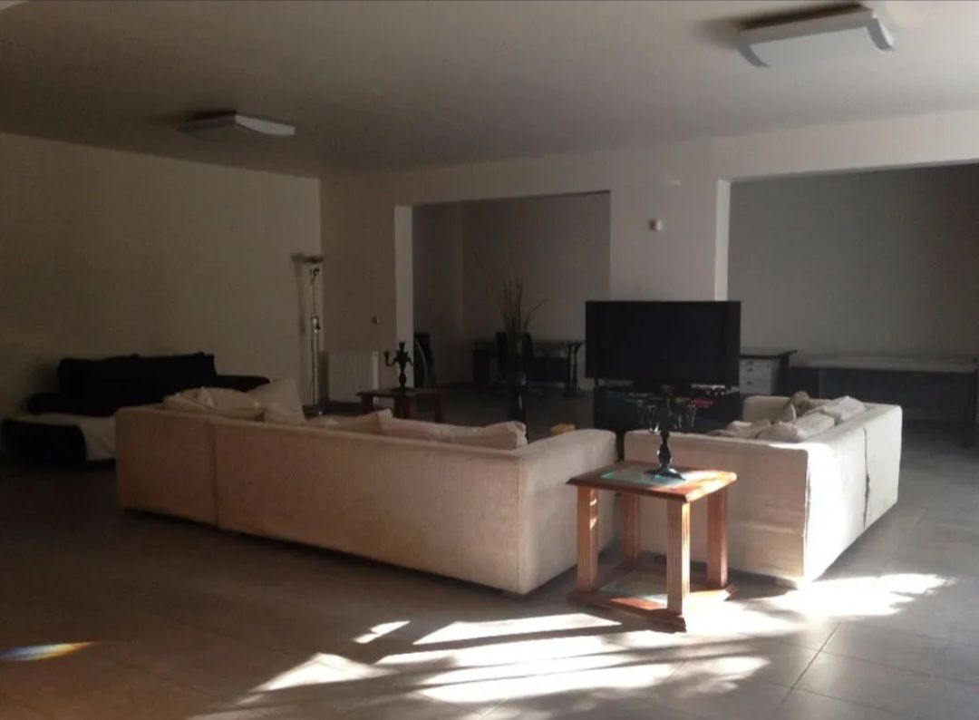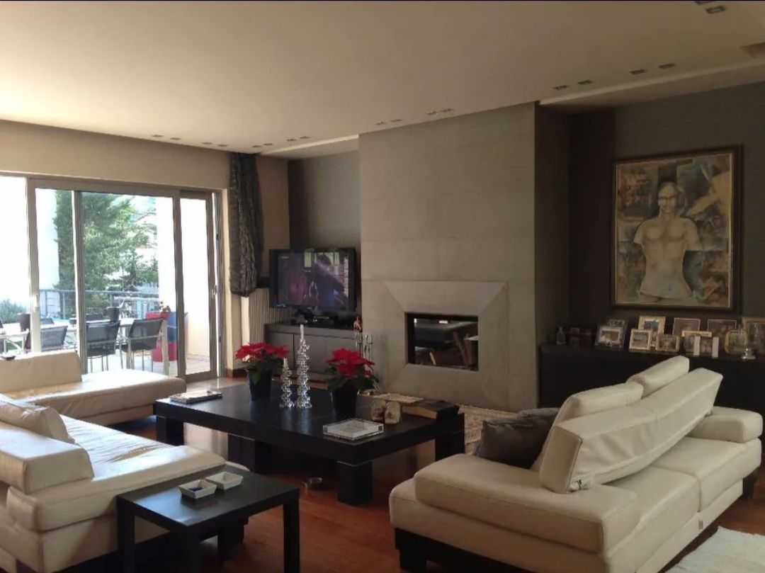 Στο ισόγειο βρίσκεται ένας ιδιαίτερα ευρύχωρος χώρος σαλονιού με τζάκι και μεγάλες γυάλινες επιφάνειες, οι οποίες οδηγούν απευθείας στον εξωτερικό χώρο και την πισίνα (25 τ.μ.). Στο ίδιο επίπεδο υπάρχει ανεξάρτητη κουζίνα με εντοιχισμένες ηλεκτρικές συσκευές και WC επισκεπτών.