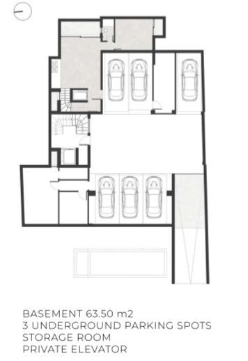 Το κατώτερο επίπεδο (63,50 τ.μ.) περιλαμβάνει τρεις ιδιωτικές θέσεις στάθμευσης και αποθηκευτικό χώρο, ενώ εξυπηρετείται από ιδιωτικό ανελκυστήρα που συνδέει και τα δύο επίπεδα, προσφέροντας άνεση και ευκολία.