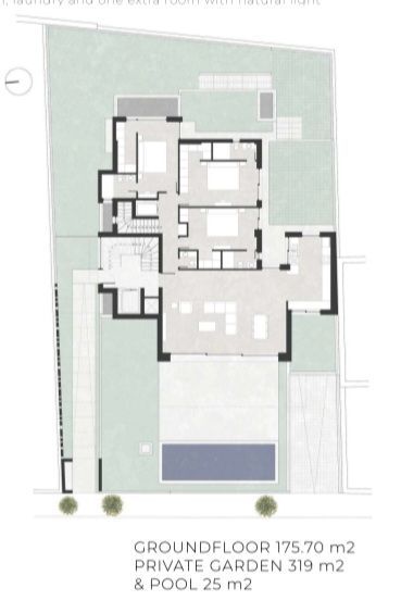 Το κύριο επίπεδο (175,70 τ.μ.) διαθέτει ευρύχωρη και λειτουργική διαρρύθμιση, με τρία master υπνοδωμάτια, ένα WC επισκεπτών και ενιαίο χώρο κουζίνας, σαλονιού και τραπεζαρίας. Οι μεγάλες ανοιγόμενες επιφάνειες συνδέουν αρμονικά το εσωτερικό με έναν ιδιωτικό διαμορφωμένο κήπο 319 τ.μ., ο οποίος περιλαμβάνει ιδιωτική πισίνα 25 τ.μ., ιδανική για στιγμές χαλάρωσης και φιλοξενίας.