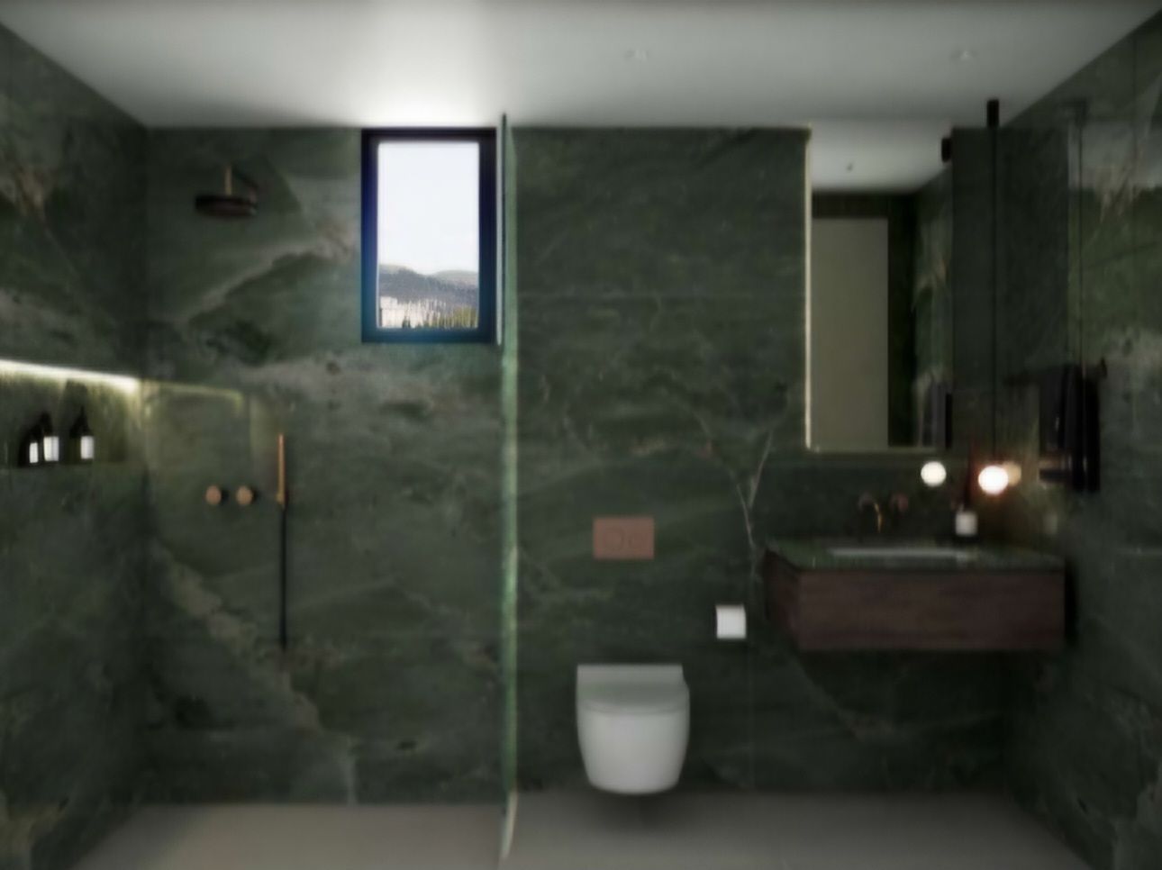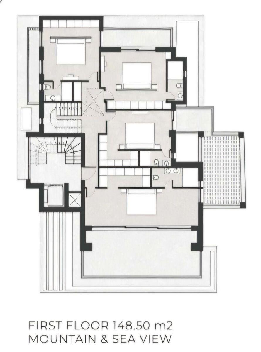 Το πρώτο επίπεδο (148,50 τ.μ.) διαθέτει τέσσερα υπνοδωμάτια master, το καθένα με το δικό του ιδιωτικό μπαλκόνι, εξασφαλίζοντας άνεση, ιδιωτικότητα και άπλετο φυσικό φως.