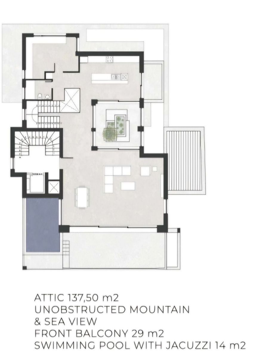 Η μπροστινή βεράντα (29 τ.μ.) αποτελεί ένα από τα πιο εντυπωσιακά στοιχεία του ακινήτου, καθώς διαθέτει ιδιωτική πισίνα 14 τ.μ. με jacuzzi και προσφέρει ανεμπόδιστη θέα έως τη μαρίνα του Αστέρα, δημιουργώντας ιδανικό περιβάλλον για χαλάρωση και φιλοξενία.
