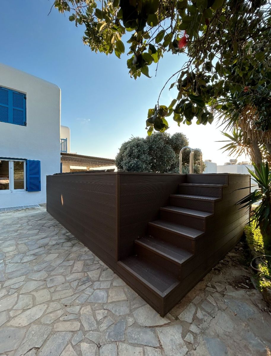 Οι εξωτερικοί χώροι είναι εξίσου εντυπωσιακοί, με δύο ευρύχωρες βεράντες που προσφέρουν άνετους χώρους χαλάρωσης, με καθιστικά, ξαπλώστρες και κούνιες. Η ιδιωτική πισίνα εξασφαλίζει απόλυτη ιδιωτικότητα, ενώ οι ιδιοκτήτες έχουν επιπλέον πρόσβαση σε κοινόχρηστη πισίνα εντός του συγκροτήματος, το οποίο αποτελείται από μόλις πέντε αποκλειστικές μεζονέτες.